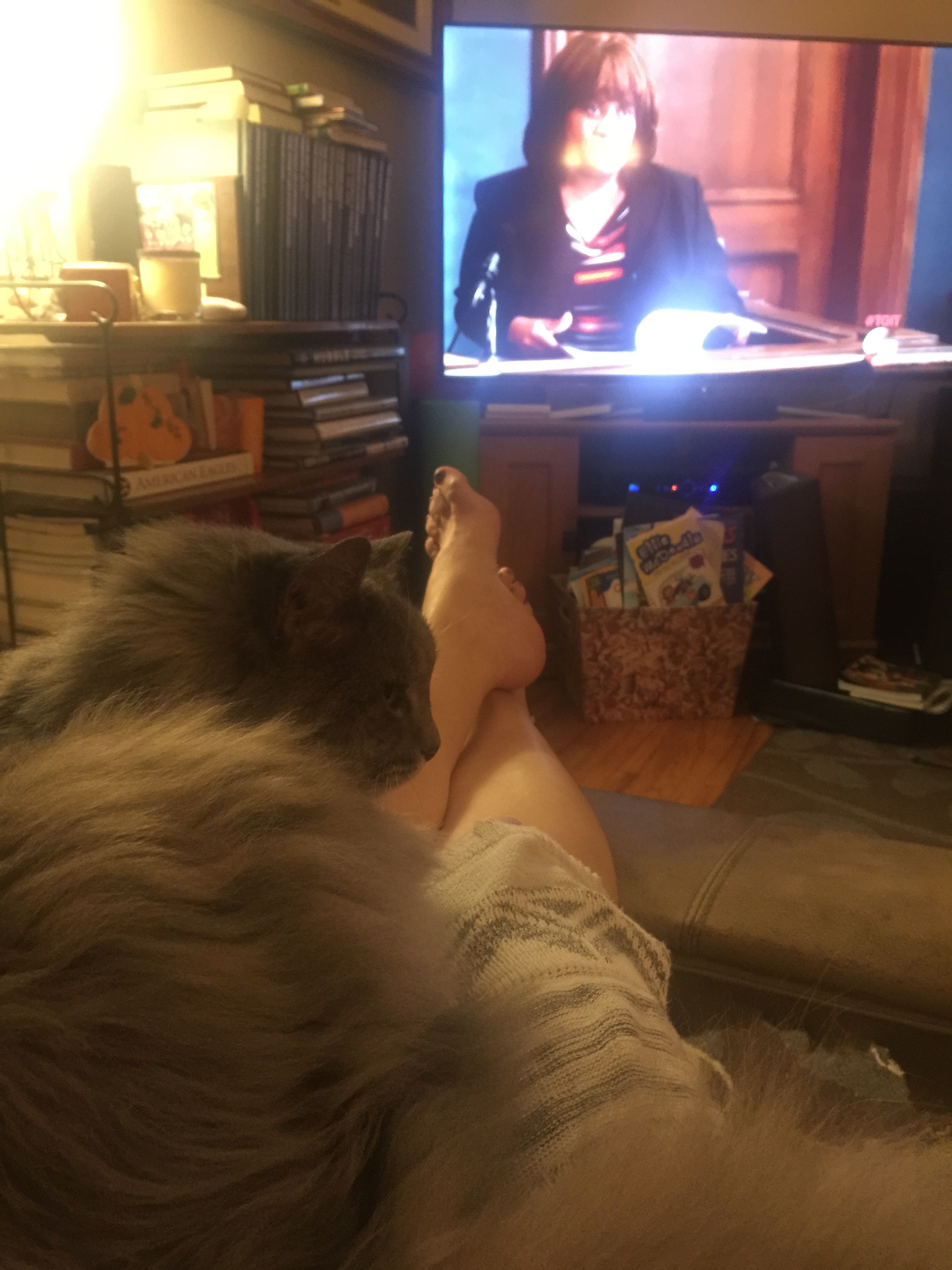I went back into my meeting, but was not productive or helpful. I ran some errands between work and picking the kids up from school. My son came barreling out of the school with his hood up and head down, not wanting to meet my eyes. When I turned him around and walked back into his classroom to follow up with the teacher he was growling at me under his breath. The whole time his teacher was filling me in on how he had handled (not well) the rest of the day, he kept his back to us and mumbled under his breath. As we walked home he kicked fences and hit trashcans while yelling at me that he just wanted to be left alone. I agreed to let him skip both ninjutsu and soccer practice, but still needed to take his sister to both ninjutsu and girl scouts. So I let him stay home, knowing my husband was coming home early to be with him, but could barely focus on my daughter or on the Brownie meeting I had to run because I was worried about my son. I got through the Brownie meeting, came home got dinner on the table, stumbled my way through showers and bed, and then finally got to the point you see in the picture above..ratty pjs, “therapy” cat and Grey’s Anatomy (on the DVR because my son wasn’t fully in bed until almost 9pm), and a very full glass of wine.