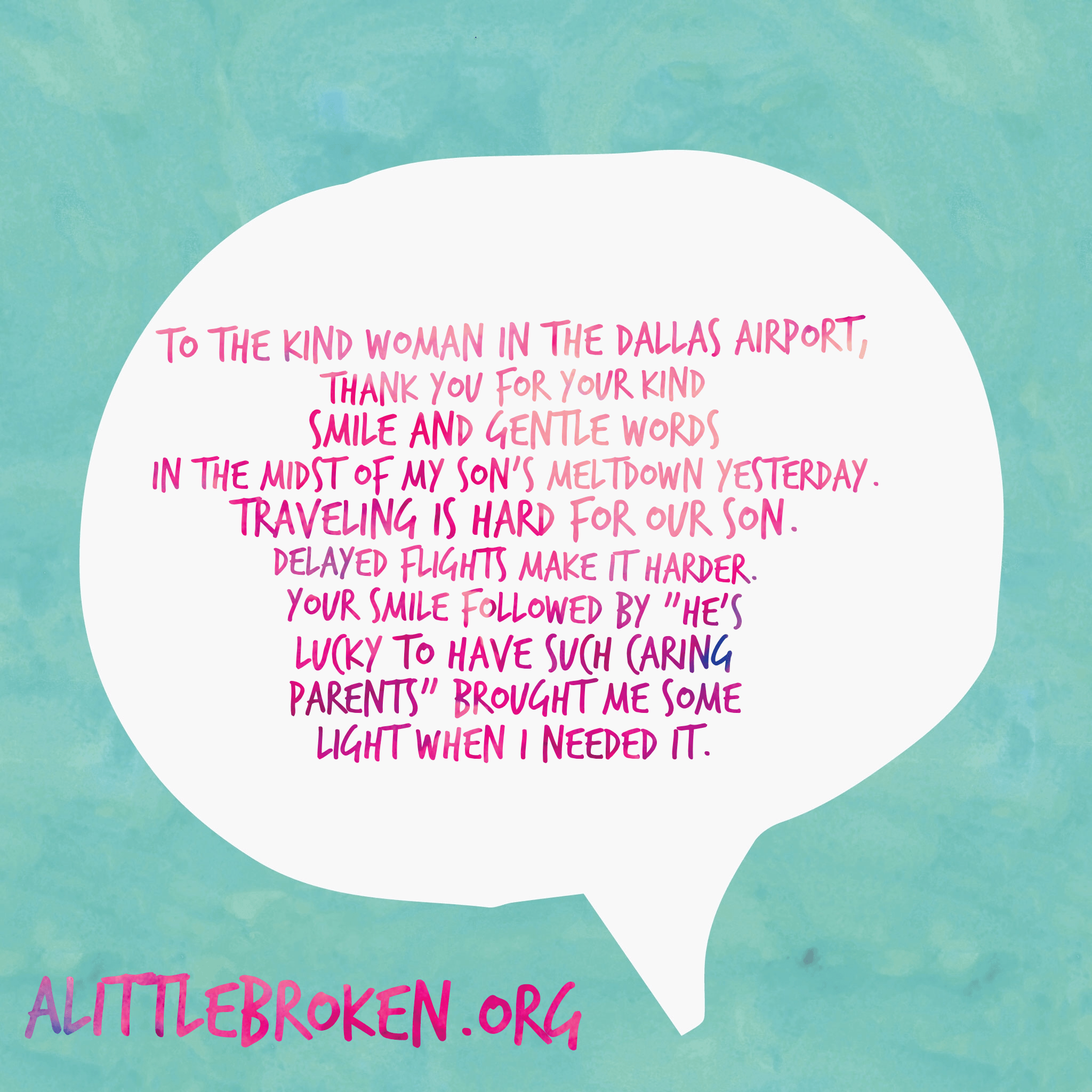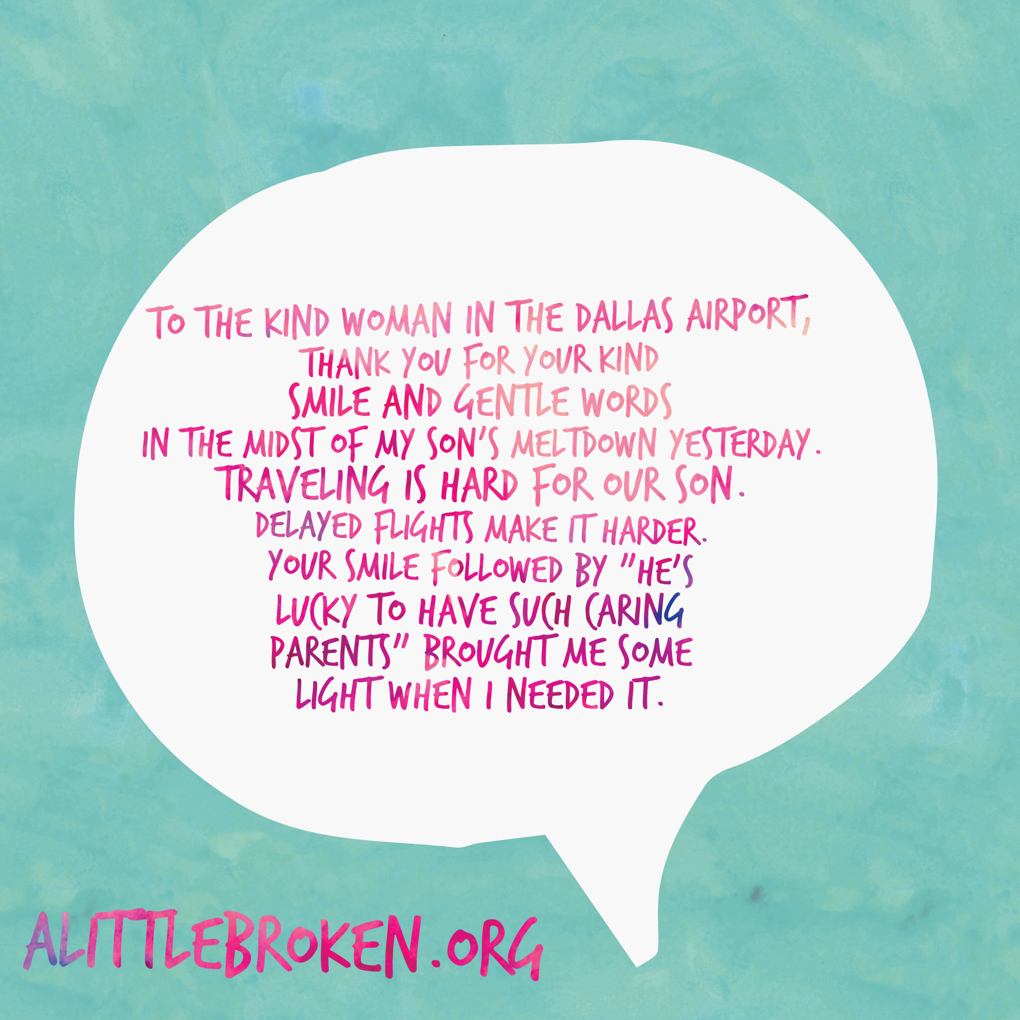 We came home last night from a week visiting my husband’s family in NJ. Travel for a kid battling anxiety and panic has the potential for disaster. He did fairly well on the way out (there is beauty in a red eye flight!), but had some really challenging moments on the way home. There were thunderstorms in the Dallas area, so our “quick” connection there turned into 2+ hours of delays. The sudden change of plans and the need to sit around waiting, was enough to send my son over the edge. He had a small panic attack. Lots of people openly stared. One person moved away. One woman smiled and spoke to me….