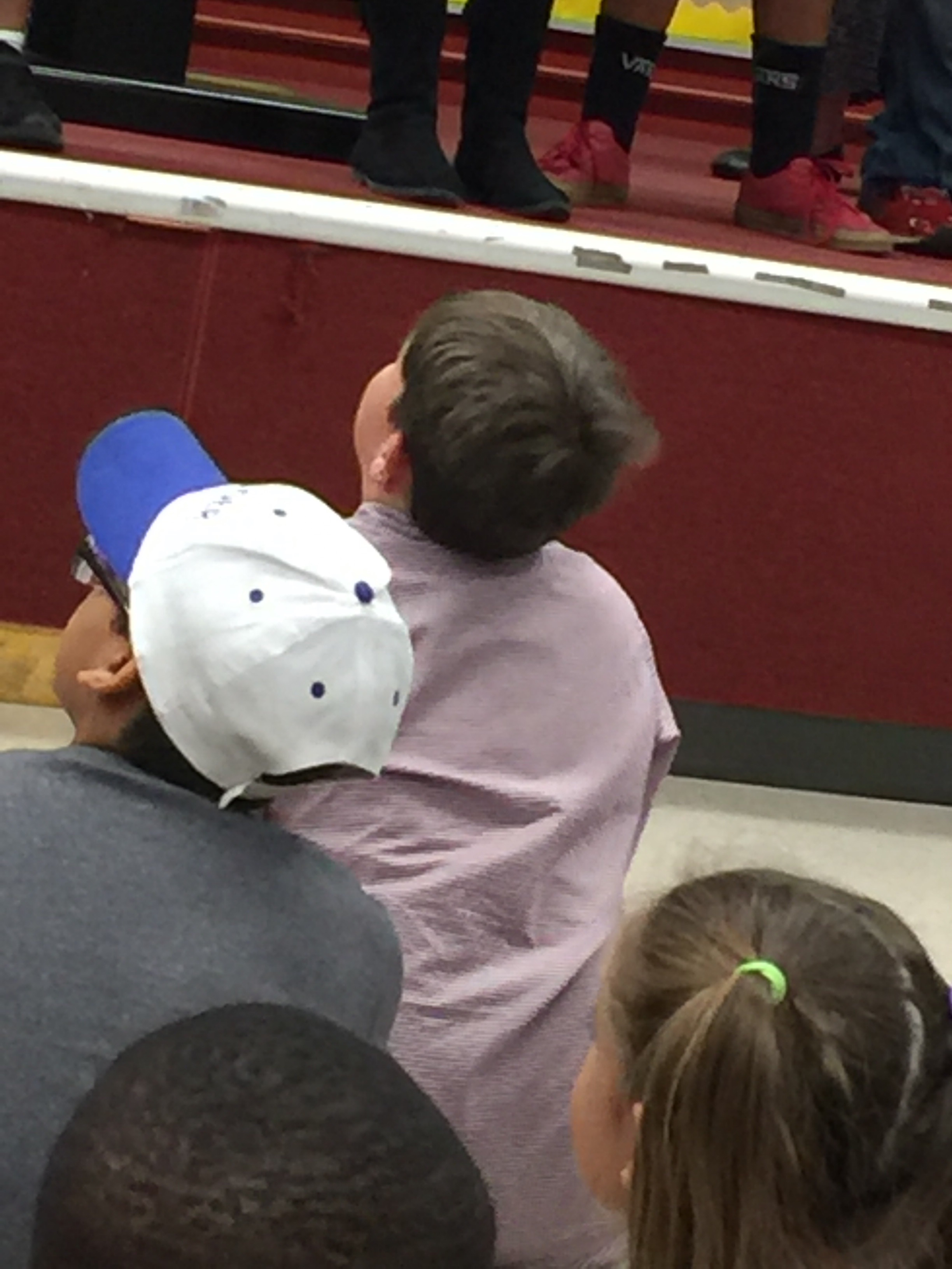 Even with that excitement, the actual act of sitting in a cafeteria full of other kids and parents was hard for him. He is doing so much better at keeping his anxiety in check, but crowds, noise, anticipation and that cafeteria all remain individual triggers. Put together, he could have been sitting in the middde of a perfect storm. At this exact awards ceremony last year, he could not even enter the cafeteria – he listened from outside the doors.