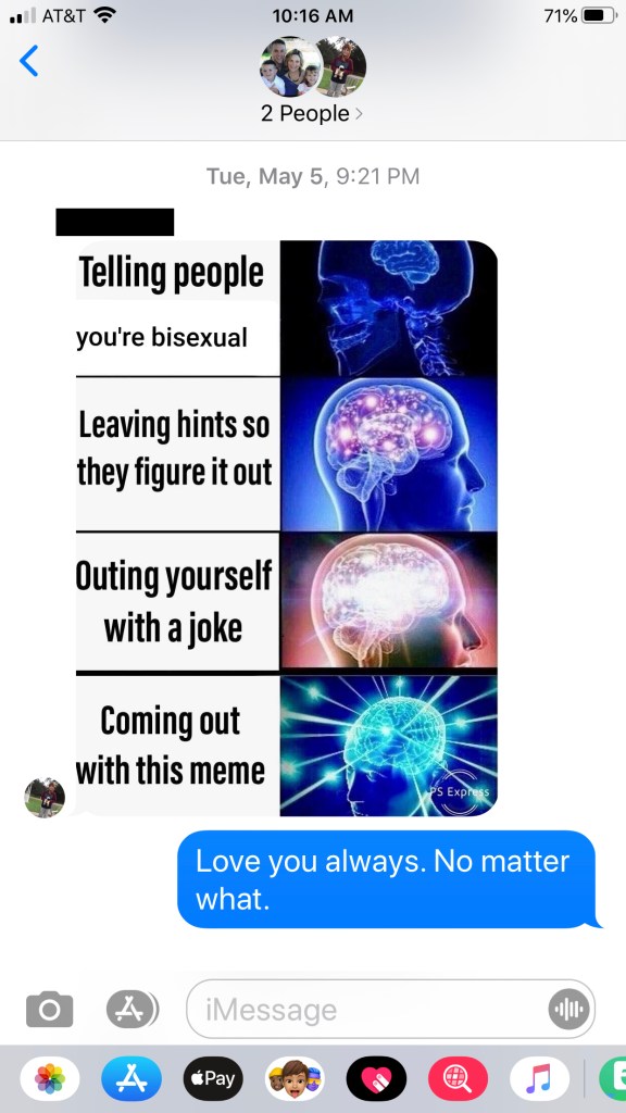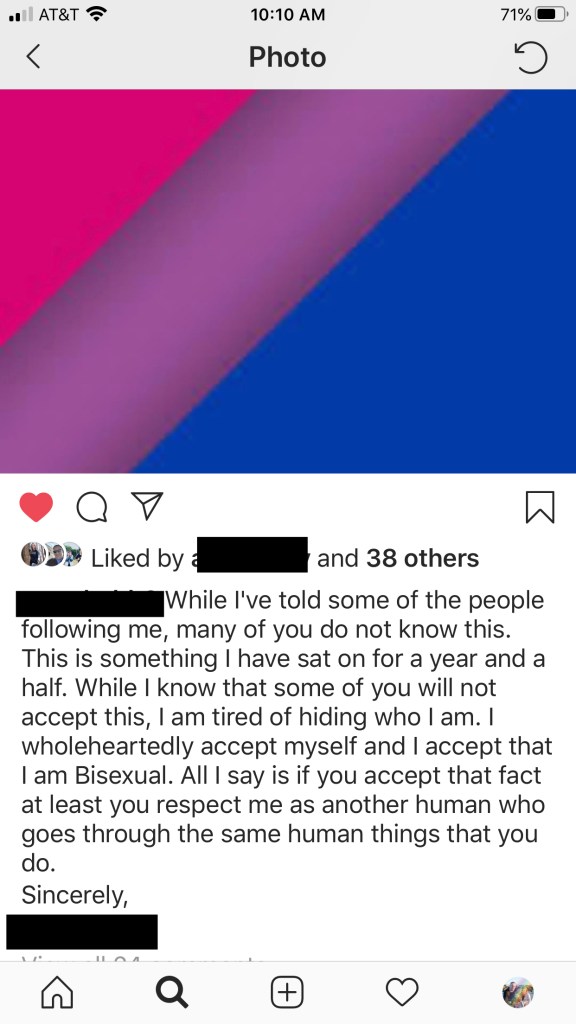 Then following a face to face conversation with us, a separate text message to his sister (with the same meme)and lots of hugs, he posted to Instagram. This was a post to his locked down account that is followed mostly by classmates, cousins, and family friends…and that he has given me explicit permission to share here. (“Share it. It’s my truth Mom. I don’t care who you tell, other people don’t change who I am.”)